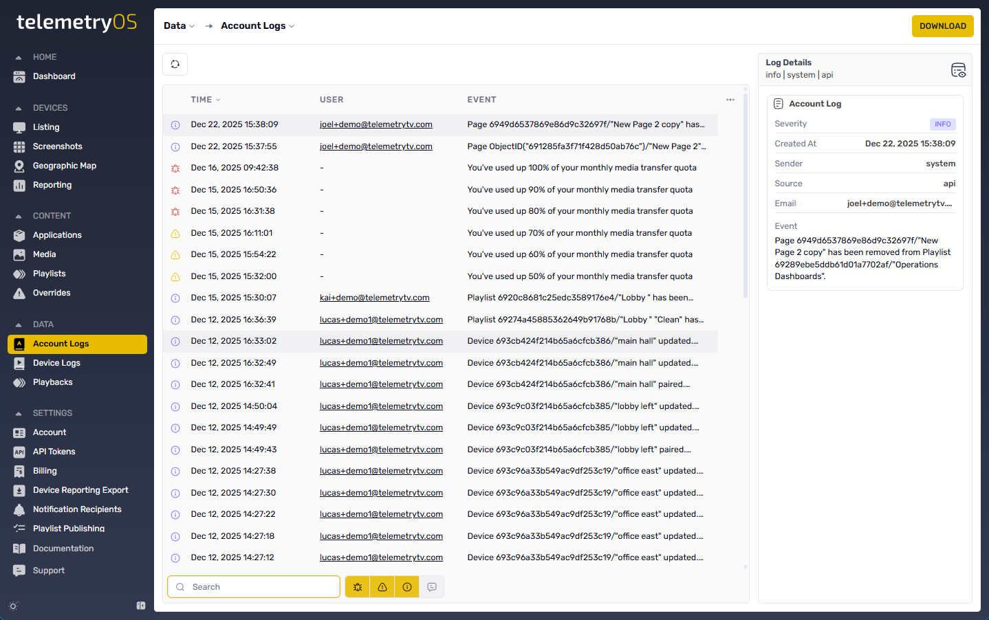 TelemetryOS's comprehensive logging system tracks a wide range of user and device actions throughout your digital signage operations. The platform monitors critical activities including billing activities, playlist assignments, and playlist name changes, creating a detailed record of all significant events. These logs serve as valuable resources that provide deep insights into the activity patterns and changes occurring within your TelemetryOS account, enabling you to maintain visibility over your account's operational status.