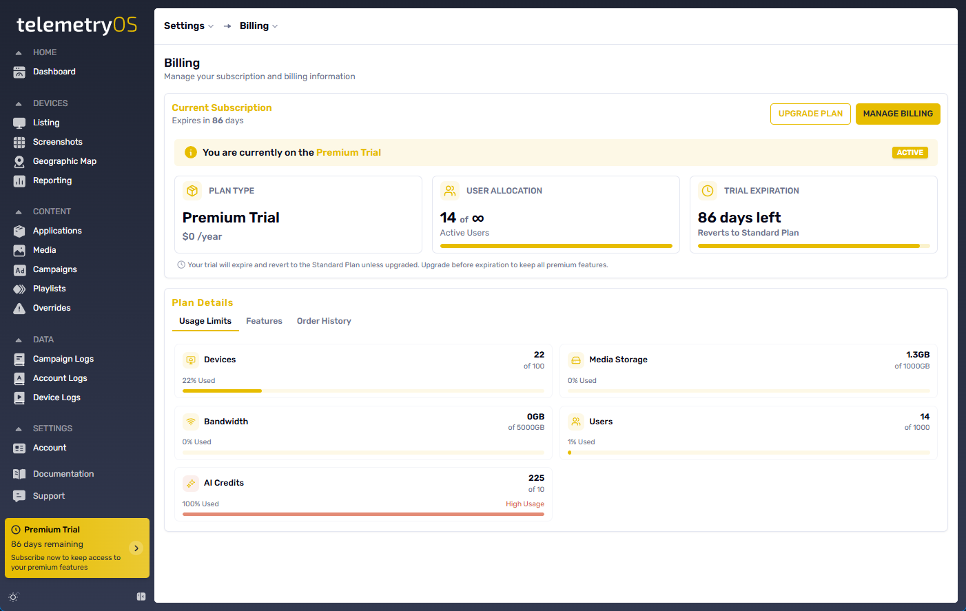 TelemetryOS uses an annual, device‑based model designed for predictability. Hardware is purchased once, and software is licensed annually with additional platform plan options that match organizational needs.