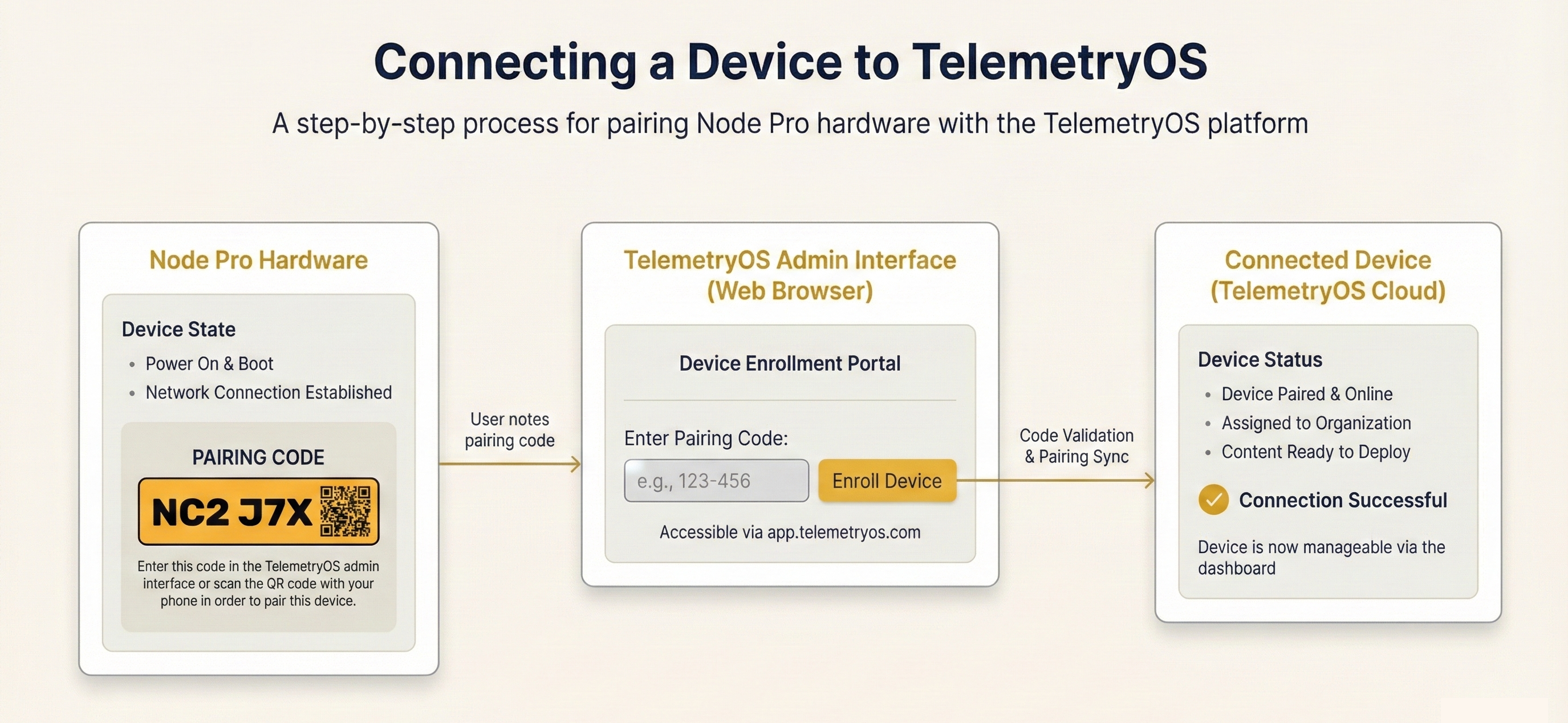Device connection enrolls Node Pro or BYOD hardware with the TelemetryOS platform. Enrolled devices appear in TelemetryOS Studio, receive applications and content, report health status, and respond to remote management commands. The enrollment process binds each device to a specific account and applies initial configuration settings.