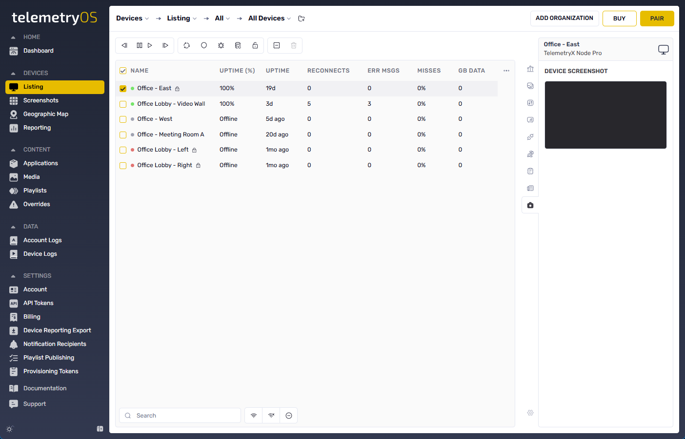 Once enrolled, devices appear in the TelemetryOS Studio device list with their serial number, MAC address, and connection status. From there, devices can be: