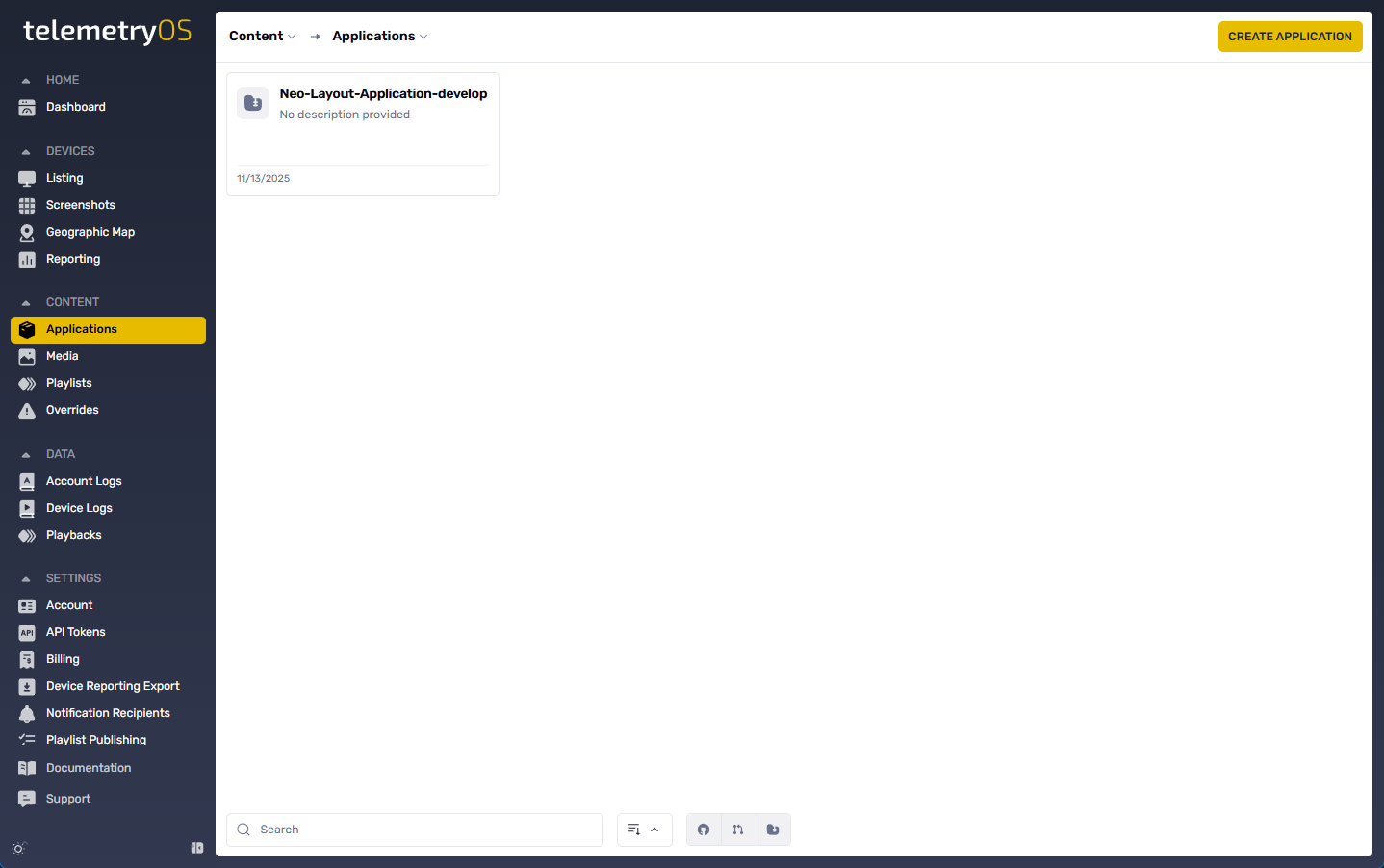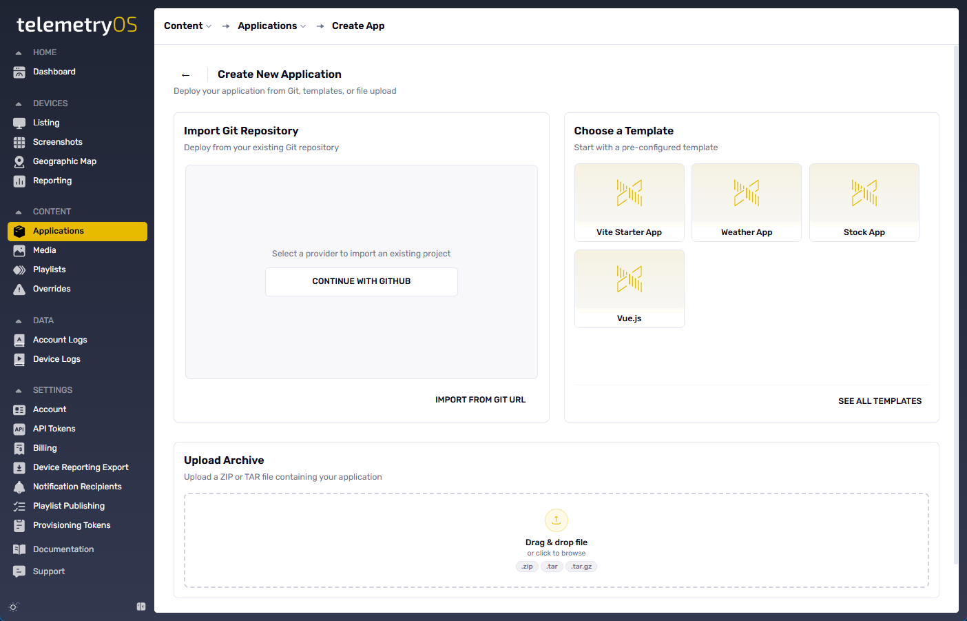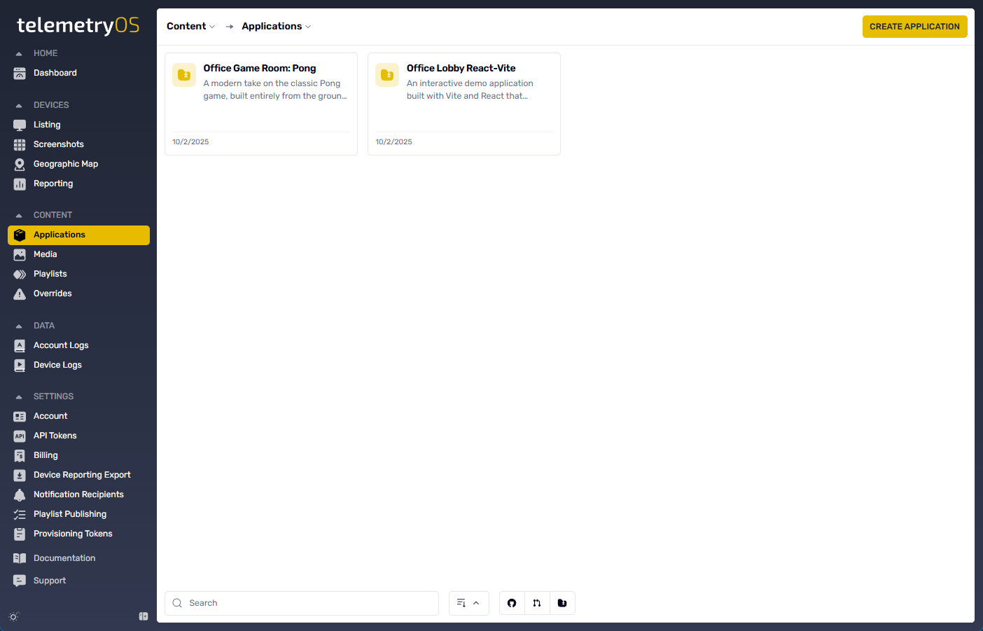After building your application code (typically using the CLI tool), you need to define it in TelemetryOS Studio to make it available for deployment to devices. This process connects your code repository to the TelemetryOS platform.