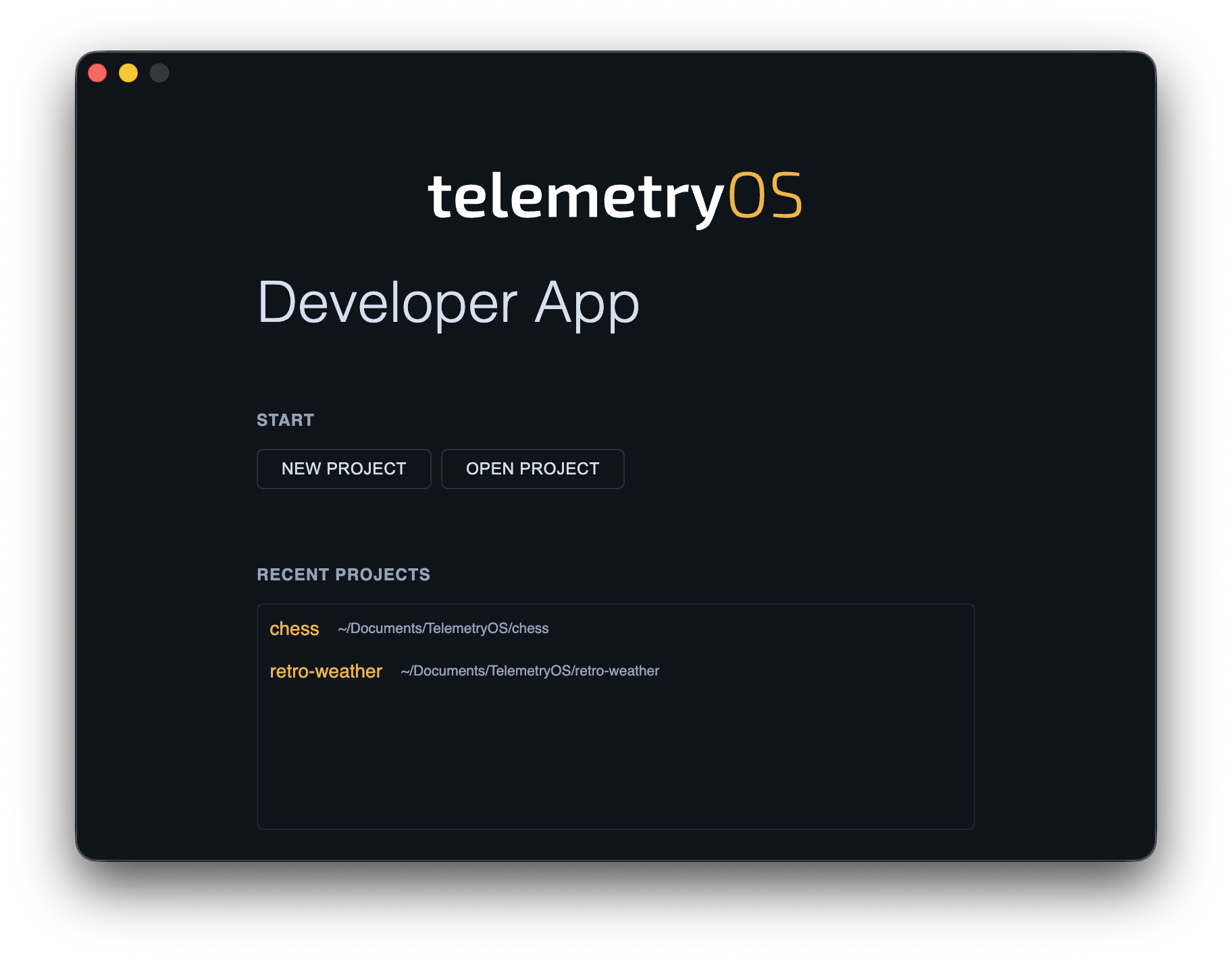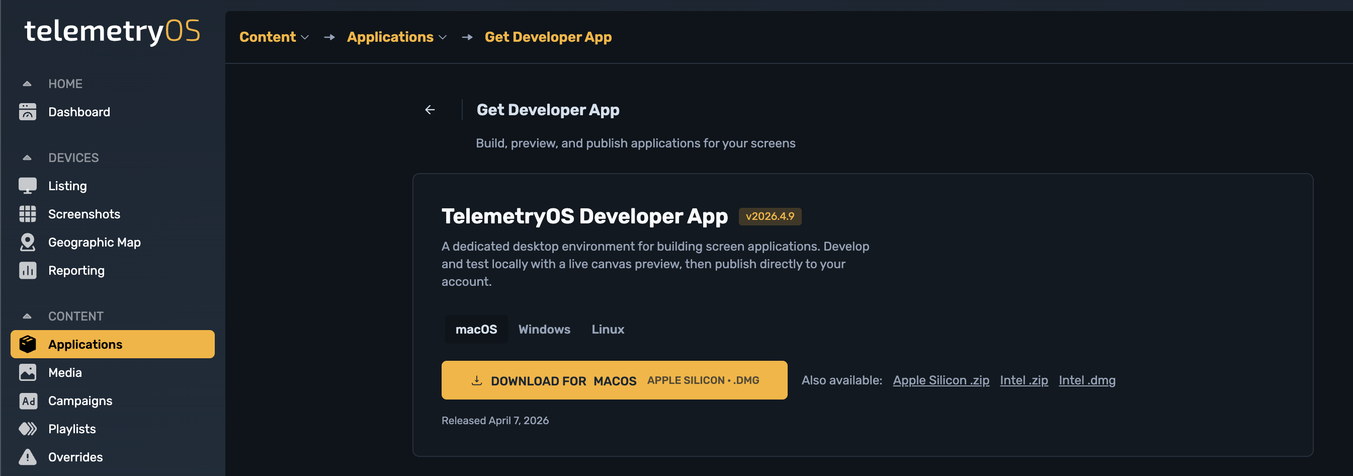 The TelemetryOS Developer App is a desktop application for building and testing TelemetryOS applications locally. It provides a simulated device runtime with live preview, canvas controls for testing different screen sizes, and tools for publishing directly to the platform.