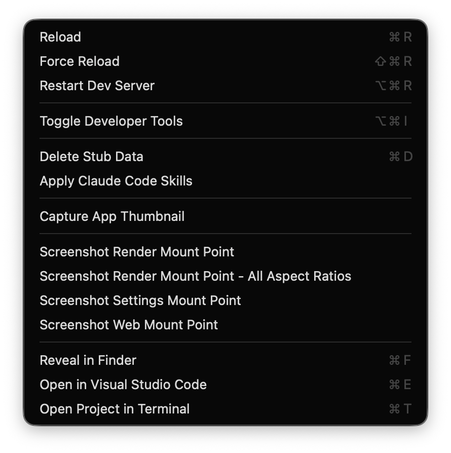 Restart Dev Server (Cmd+Alt+R) stops and restarts the underlying dev server process. Use this when hot module replacement stops working or when you need to pick up configuration changes that require a full server restart.
