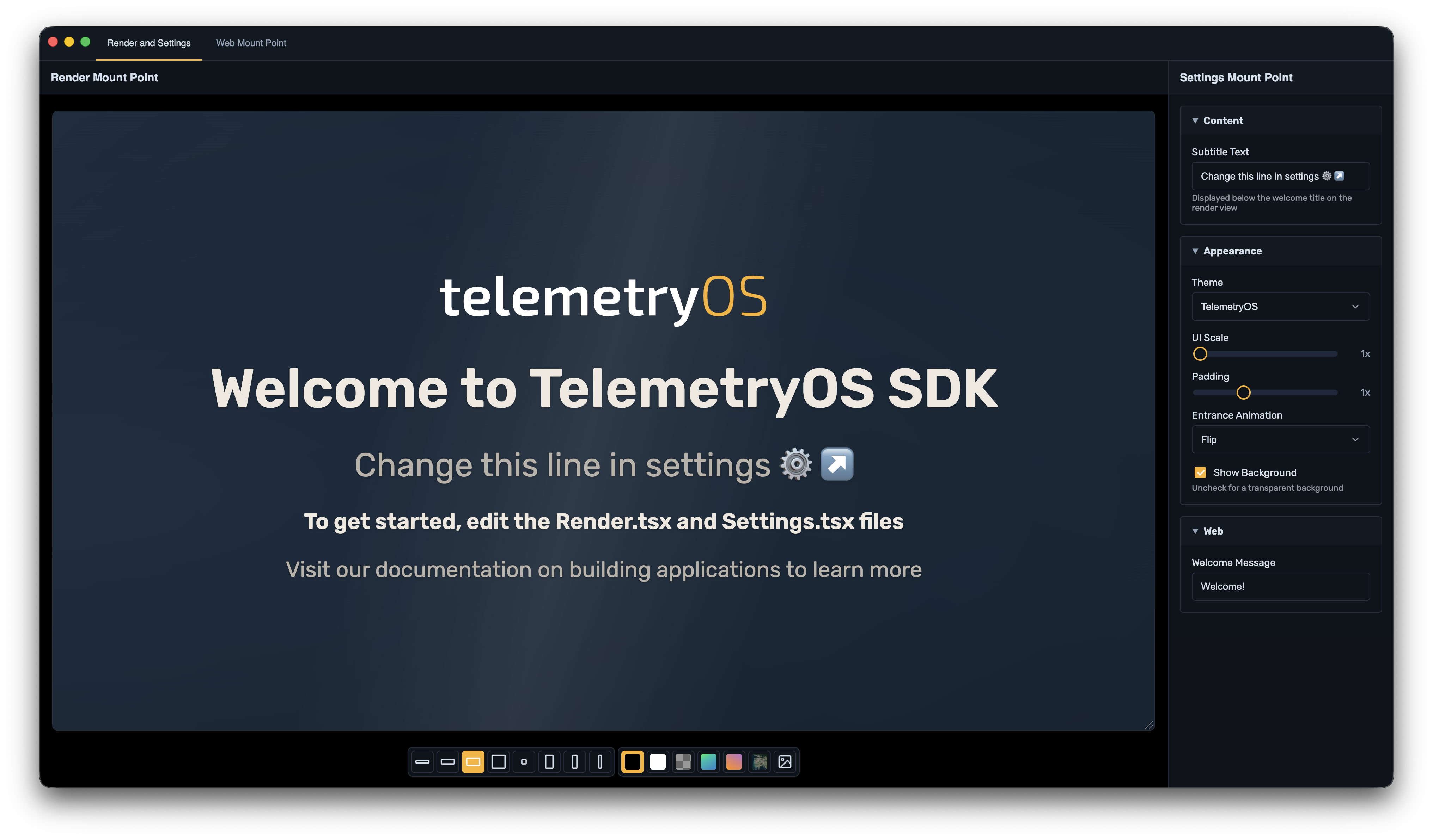 Storage writes from the settings view propagate to the render view in real time, just as they would on a deployed device. The tab bar at the top switches between the Render and Settings tab and the Web Mount Point tab (if your project has one).