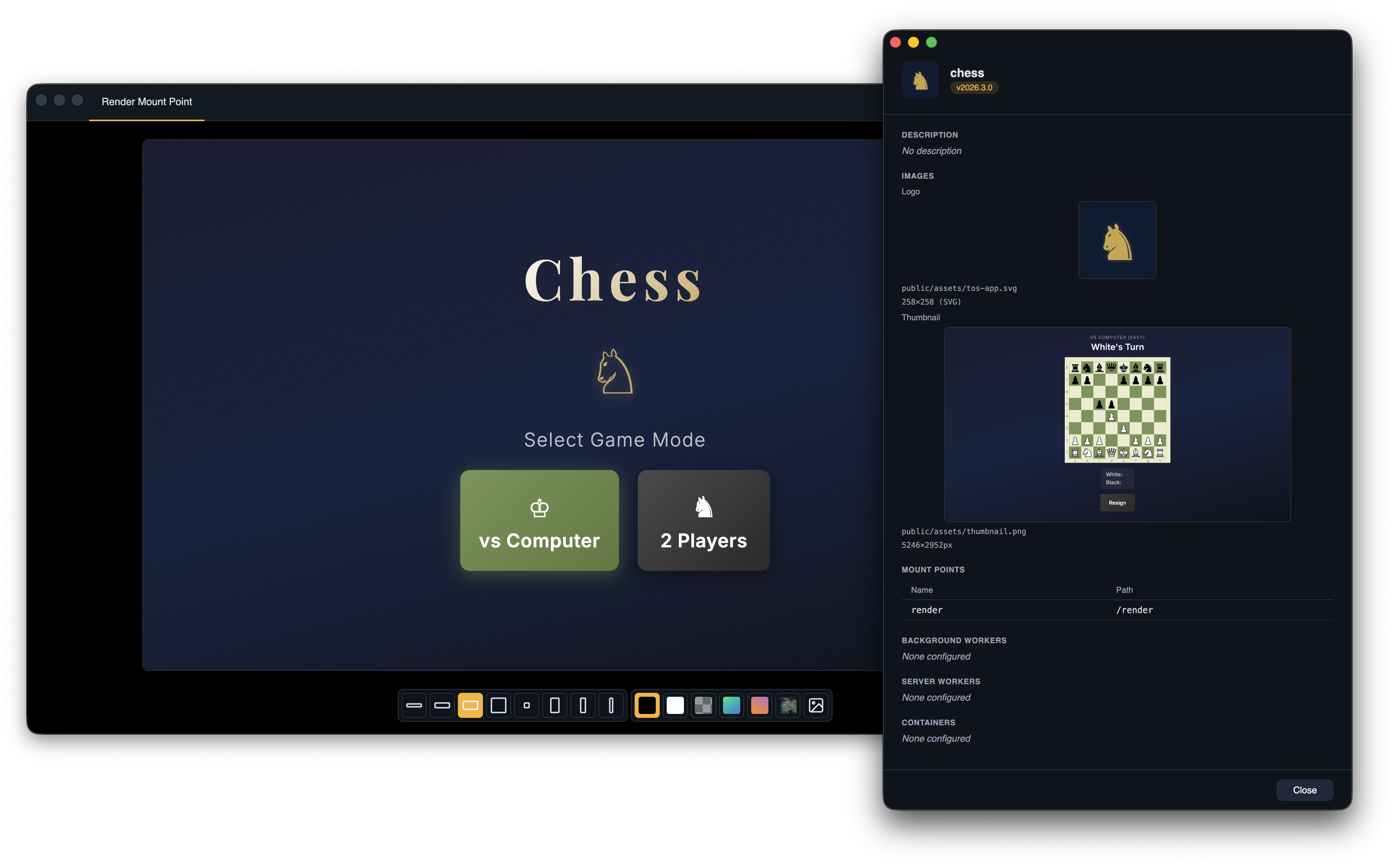 tosCLI is bundled with the Developer App. Once installed, commands liketos init,tos dev, andtos publishare available in your terminal.