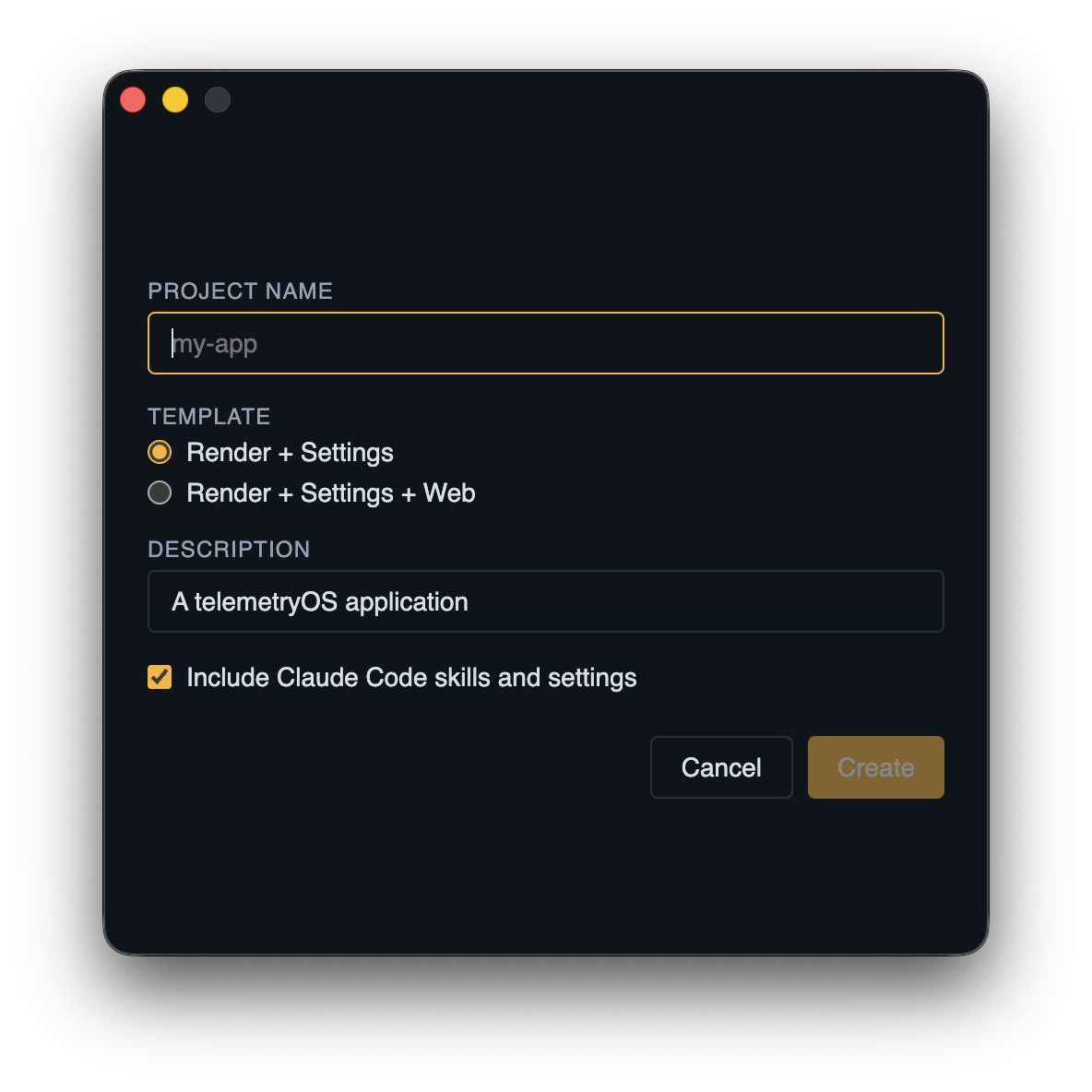 New Project opens a dialog where you name your project, choose a template, and optionally include Claude Code skills for AI-assisted development.