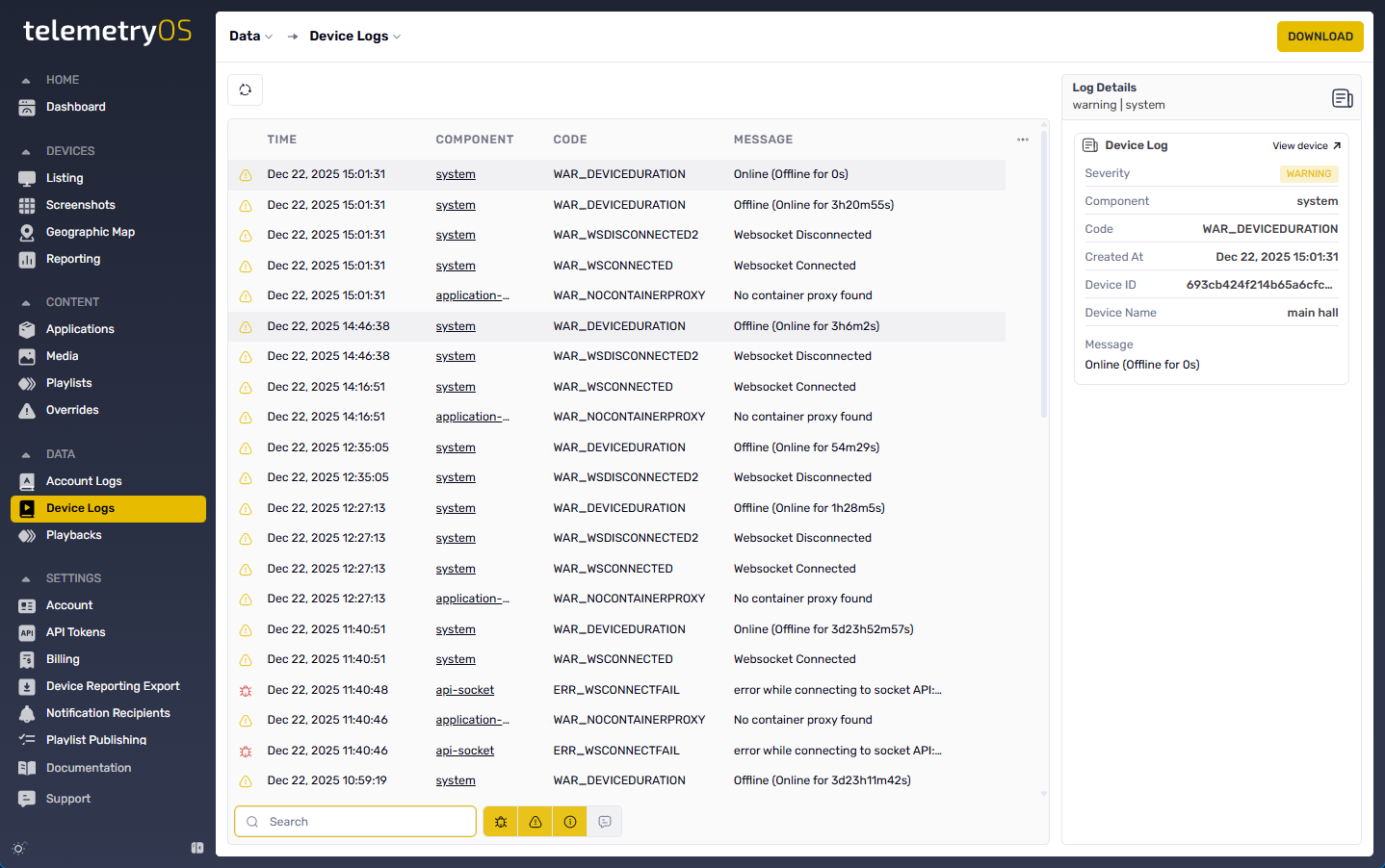 TelemetryOS interface log access provides convenience for remote device access or multi-device log overview requirements.