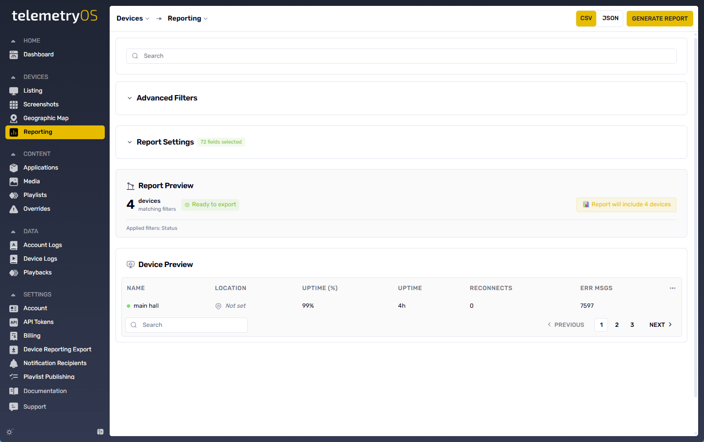 Device export functionality generates comprehensive reports of all devices within a TelemetryOS account, delivering structured data for inventory management, troubleshooting, and analytics workflows. Exports produce complete device fleet snapshots in machine-readable formats for integration with external systems.