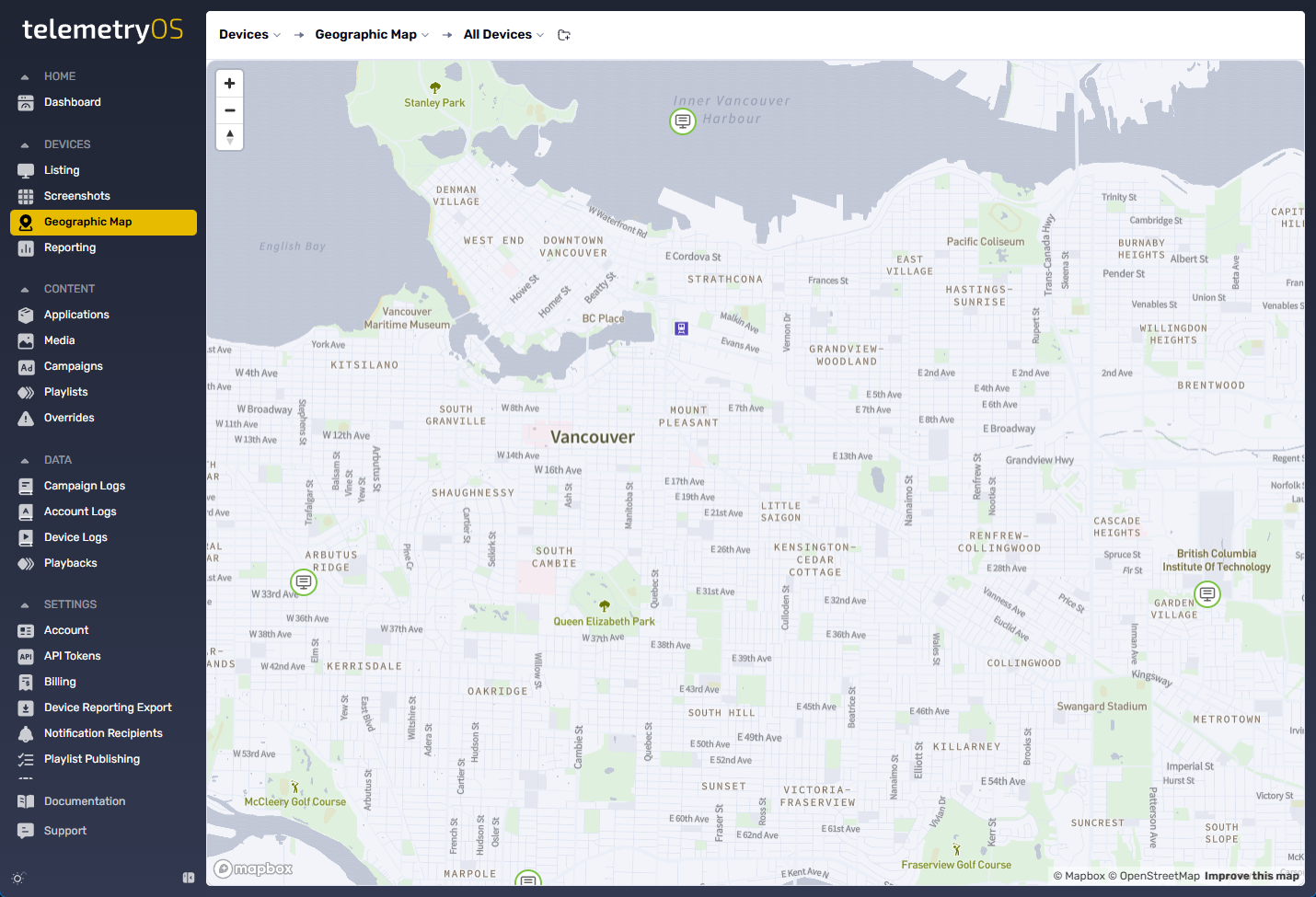 The Map feature integrates directly into the Devices tab of the TelemetryOS dashboard: