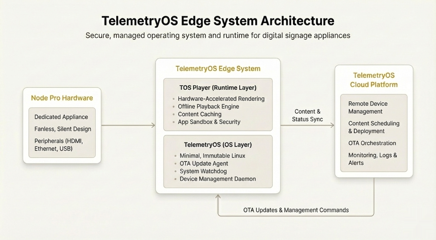 TelemetryOS Edge operates as part of a complete vertical integration: Node Pro hardware → TelemetryOS Edge OS → TOS Player runtime → TelemetryOS cloud control plane. This integration ensures optimal performance and security across all system layers.