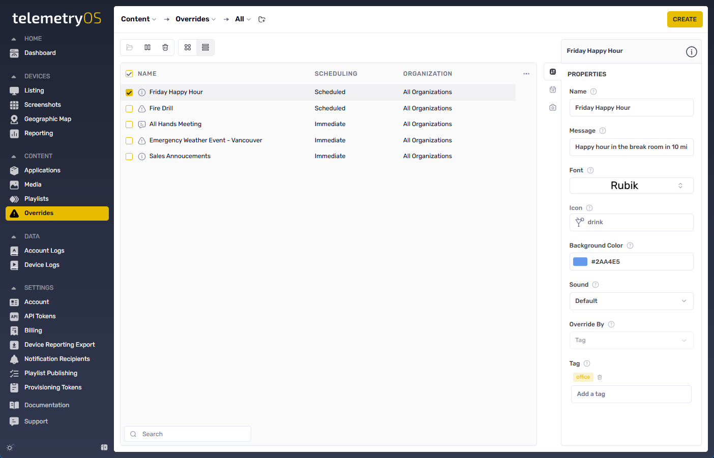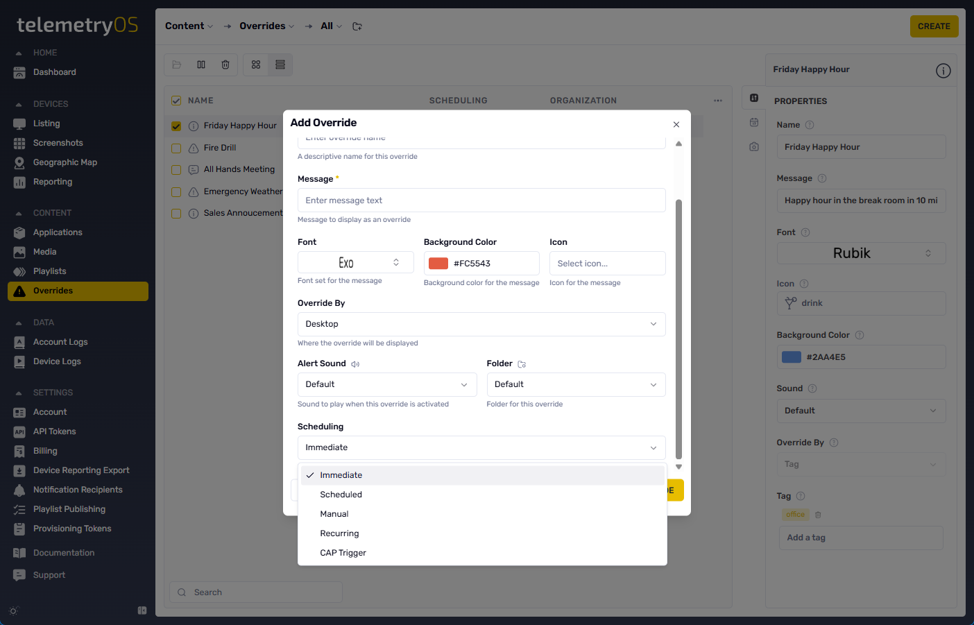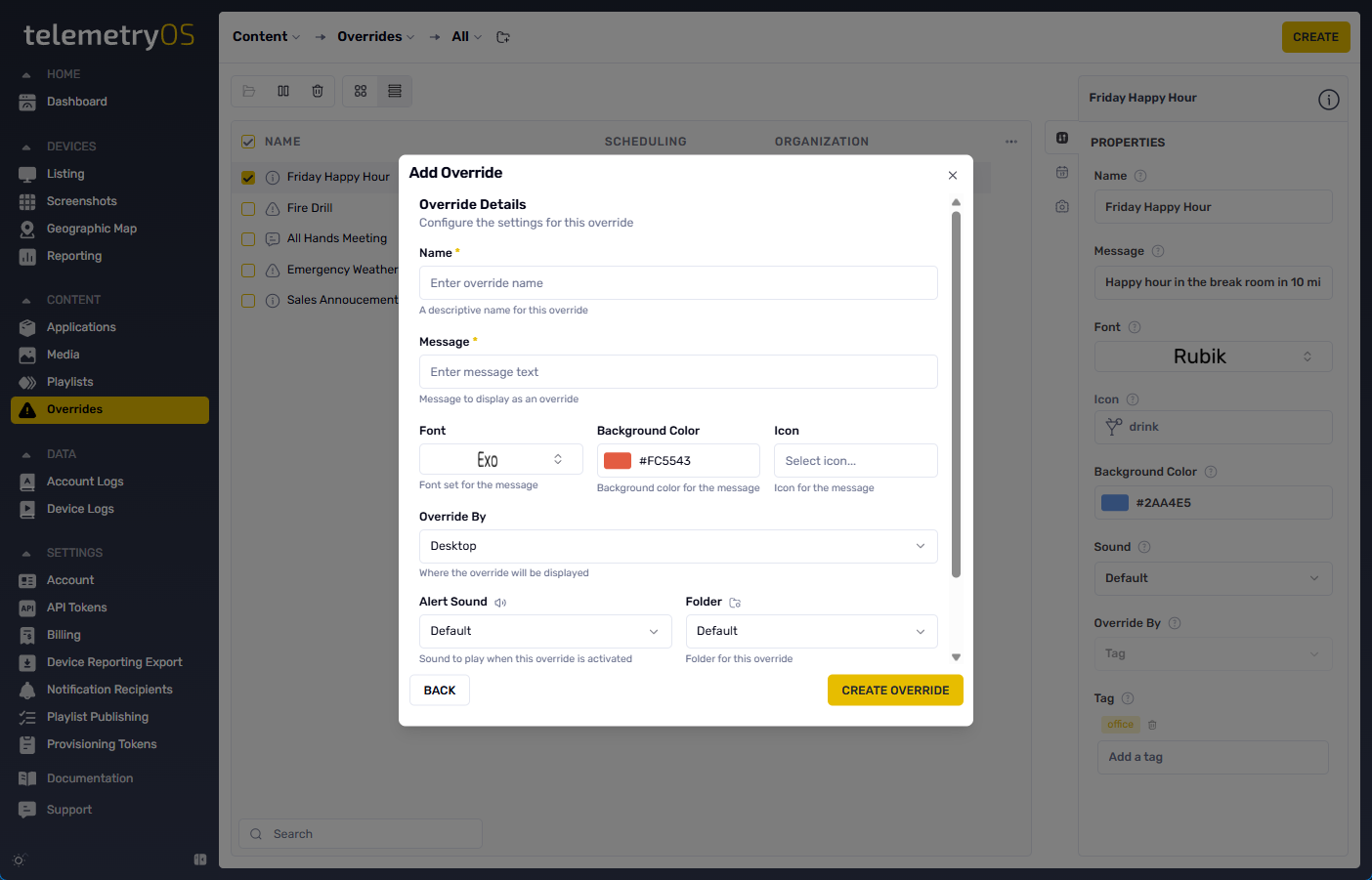 Overrides support any TelemetryOS content type including Media, Boards, Apps, or textual alerts.