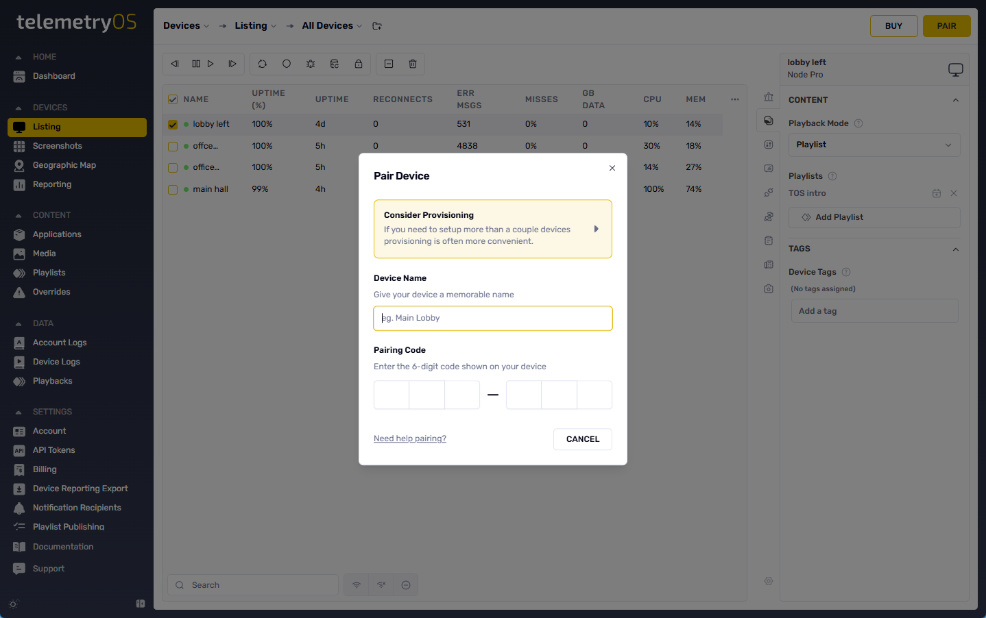 Code-based pairing connects devices to TelemetryOS through alphanumeric code entry. The pairing code displayed on-screen is entered in TelemetryOS Studio to complete enrollment.