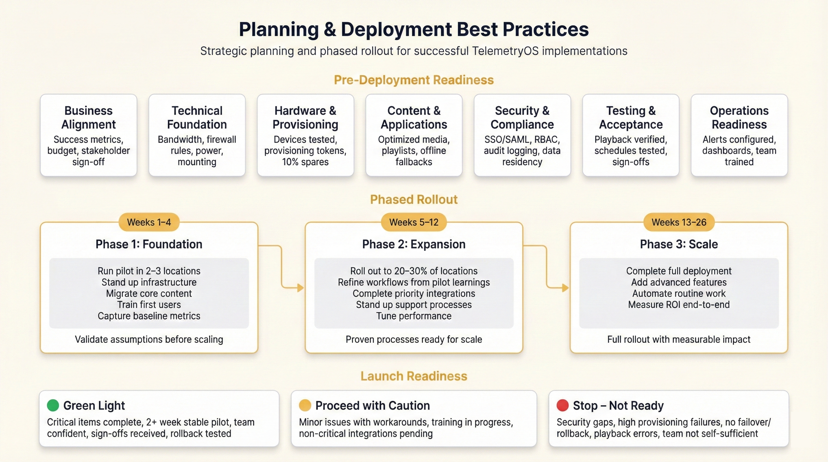 Strategic planning, deployment checklists, and best practices for successful TelemetryOS implementations