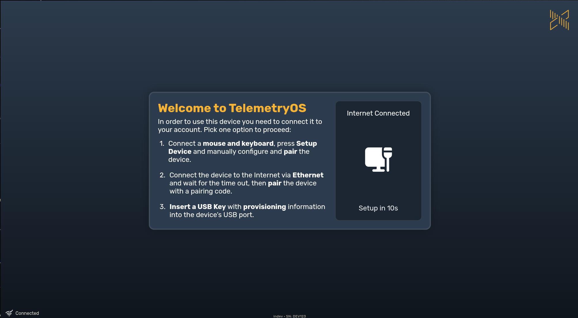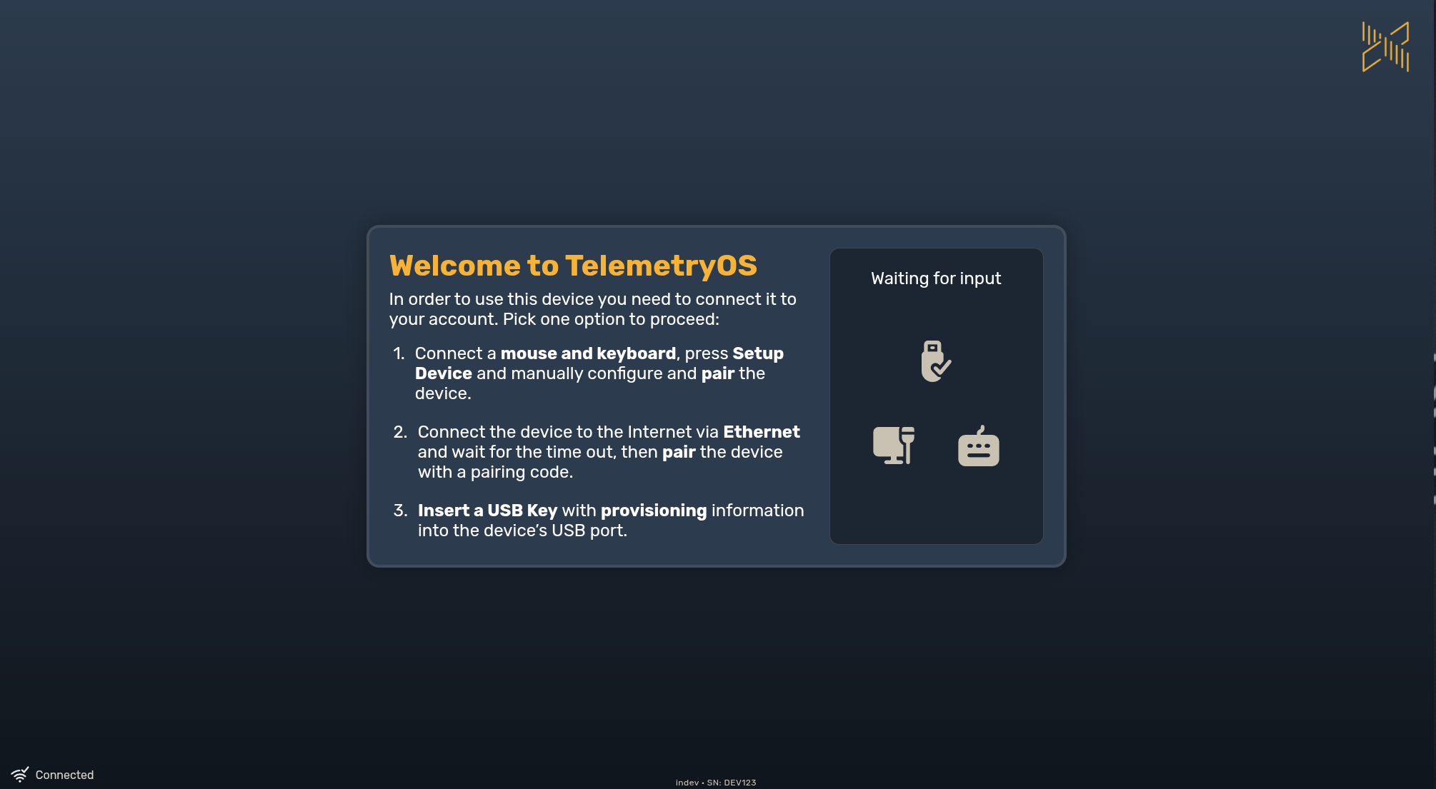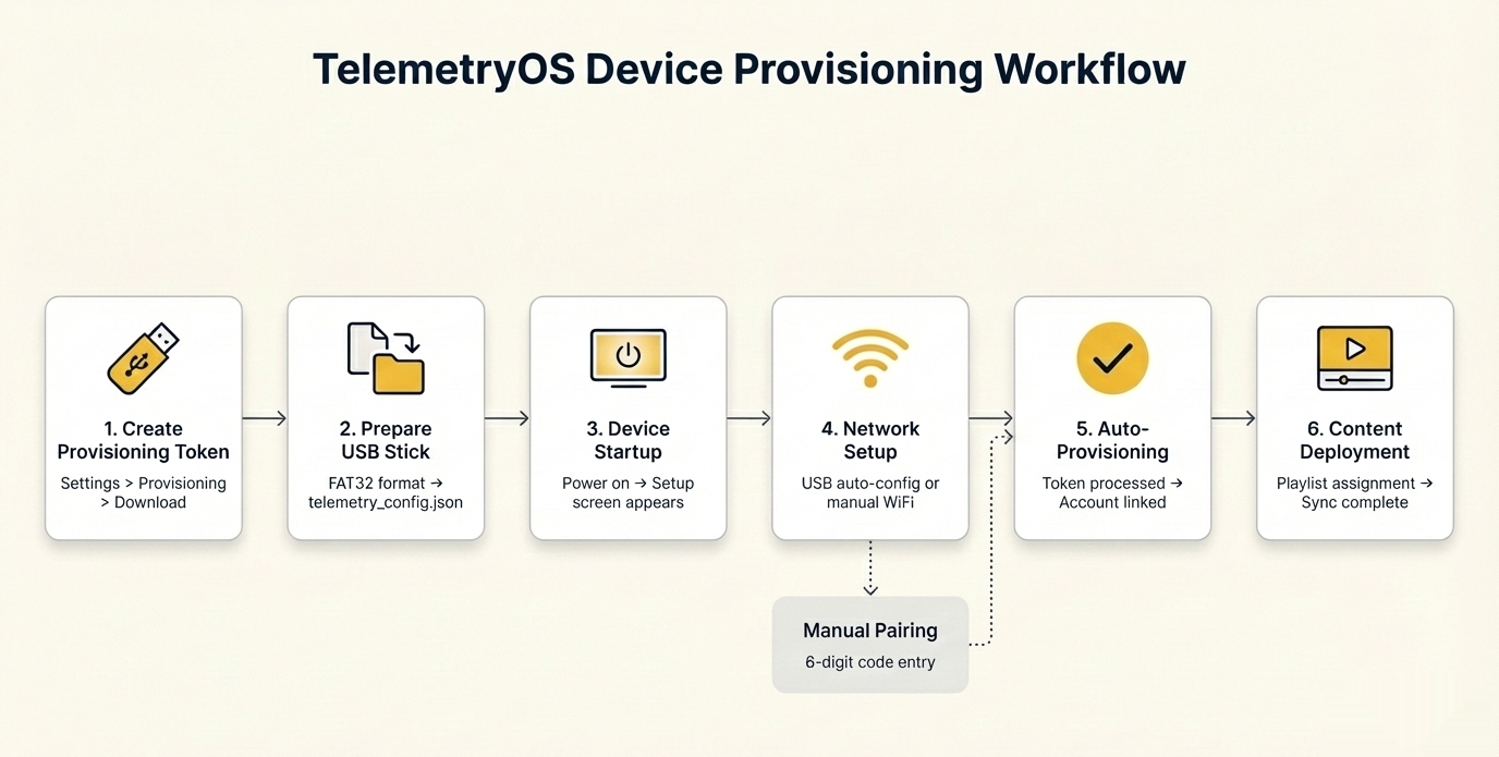 TelemetryOS device provisioning configures devices with specific settings and software for seamless platform integration. Provisioning locks devices to specific accounts.