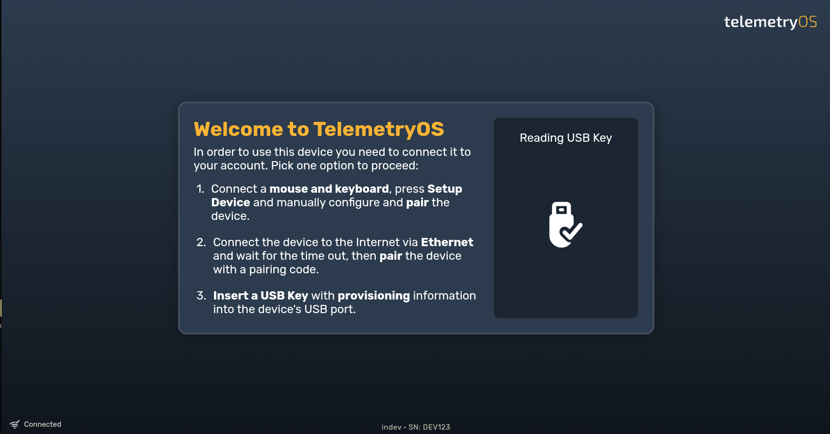 Powered TelemetryOS Edge devices display the Network Setup Screen with the message Insert USB drive to provision at the bottom right corner. USB stick insertion initiates provisioning file detection.