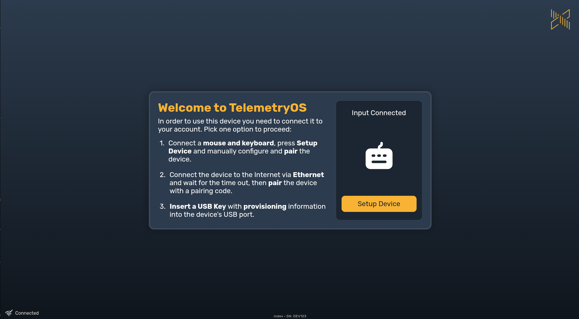 Connected devices display the Setup screen upon initial power-on. The screen displays Waiting for input when network connectivity is unavailable, and transitions to the Setup Device button when network connectivity is detected.