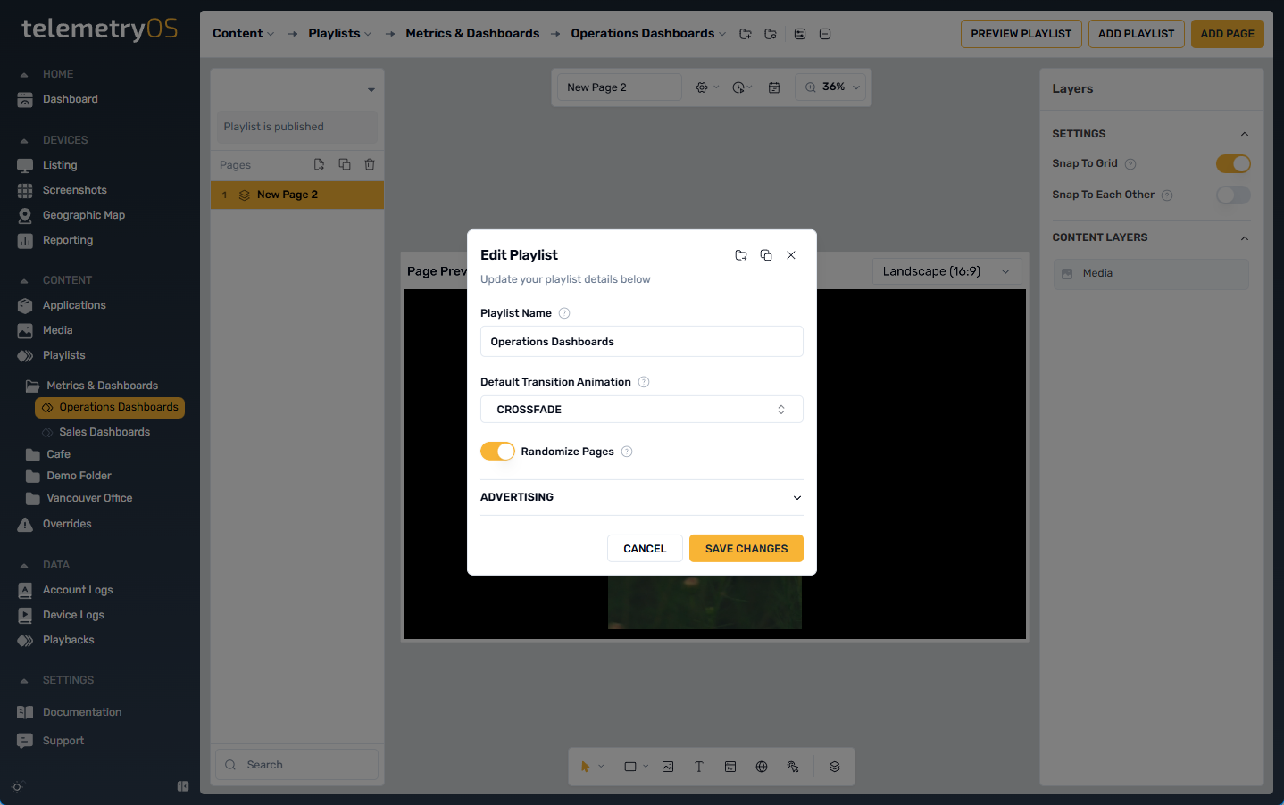 Playlist randomization configures pages and media folders to play in random order, providing dynamic and varied playback experiences.