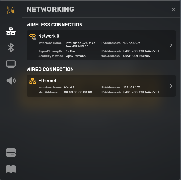 Network connectivity configures through wired (Ethernet) or wireless (Wi-Fi) interfaces based on hardware capabilities.