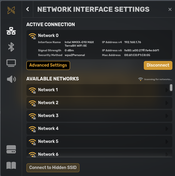 Device setup screens configure network connectivity, display settings, audio output, and system preferences during initial provisioning. These interfaces appear on-device during hardware setup before TelemetryOS pairing.