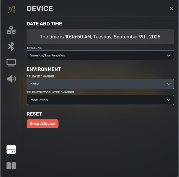 | Device Environment | TelemetryOS environment selection | Production, staging, development |