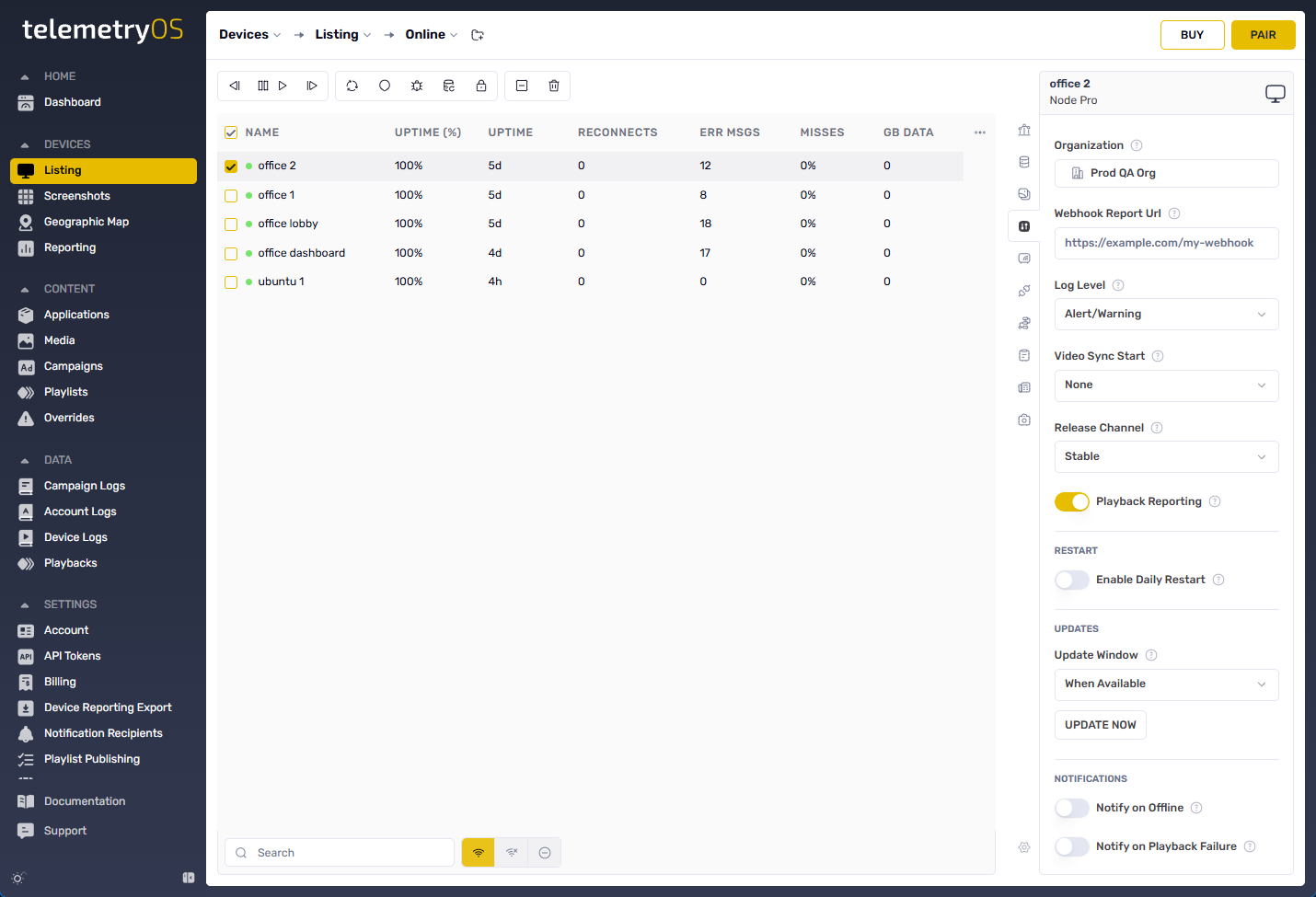 Update window settings are accessible through device-specific configuration interfaces in the TelemetryOS dashboard.