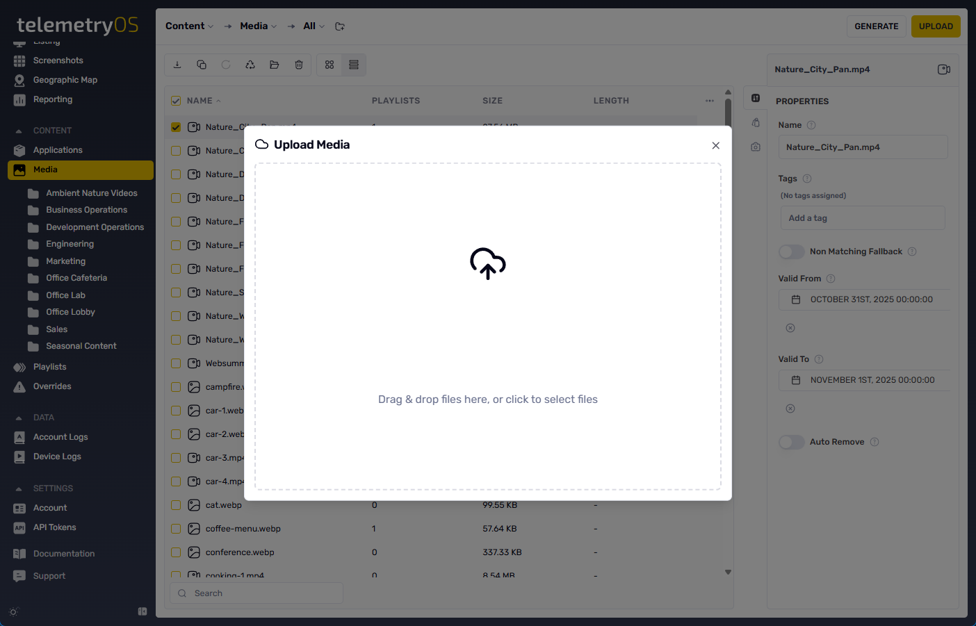 TelemetryOS includes comprehensive media management capabilities for images, videos, and documents alongside app content.