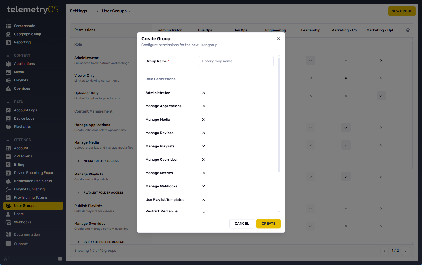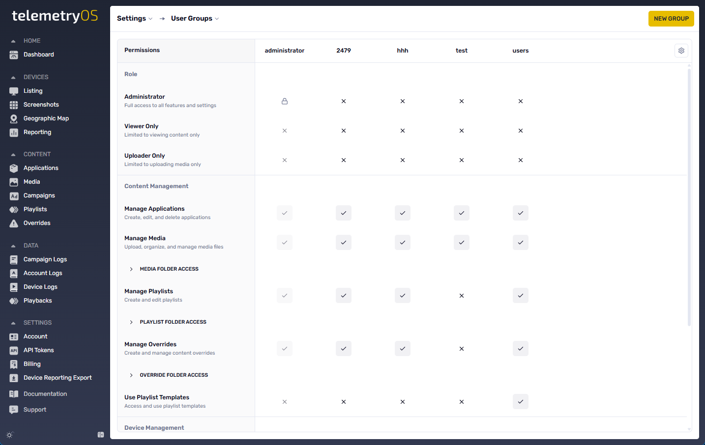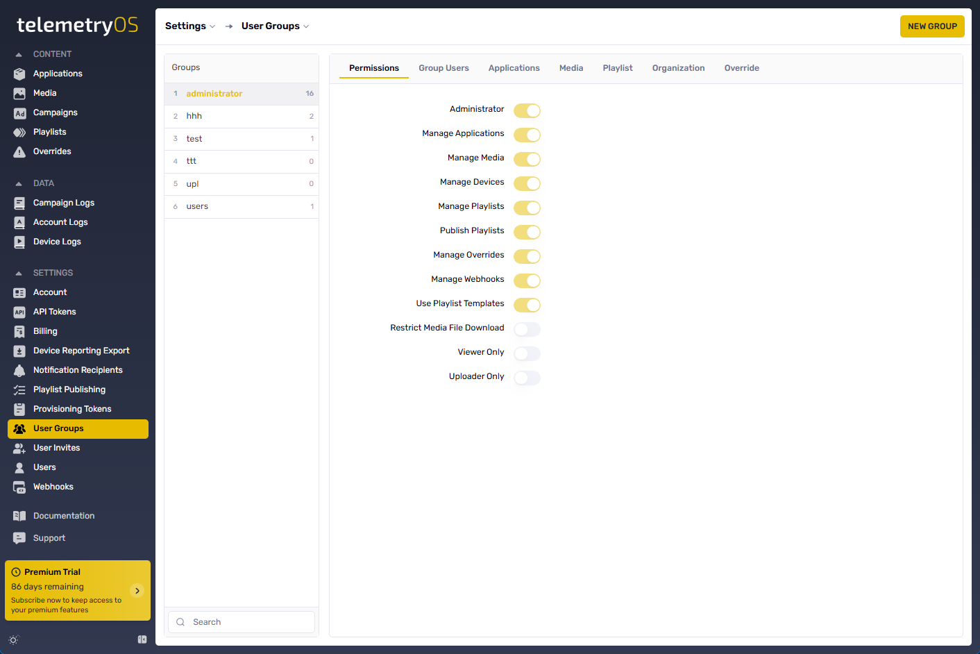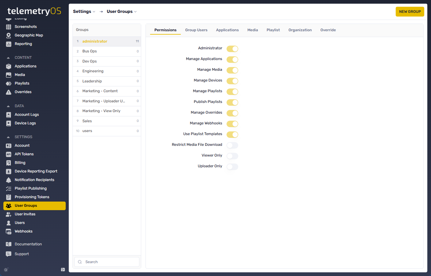 User groups represent user collectives, each assigned specific permission or privilege sets. Permissions control access to TelemetryOS features, apps, media content folders, playlists, screen overrides, devices (media players), publishing, and more.