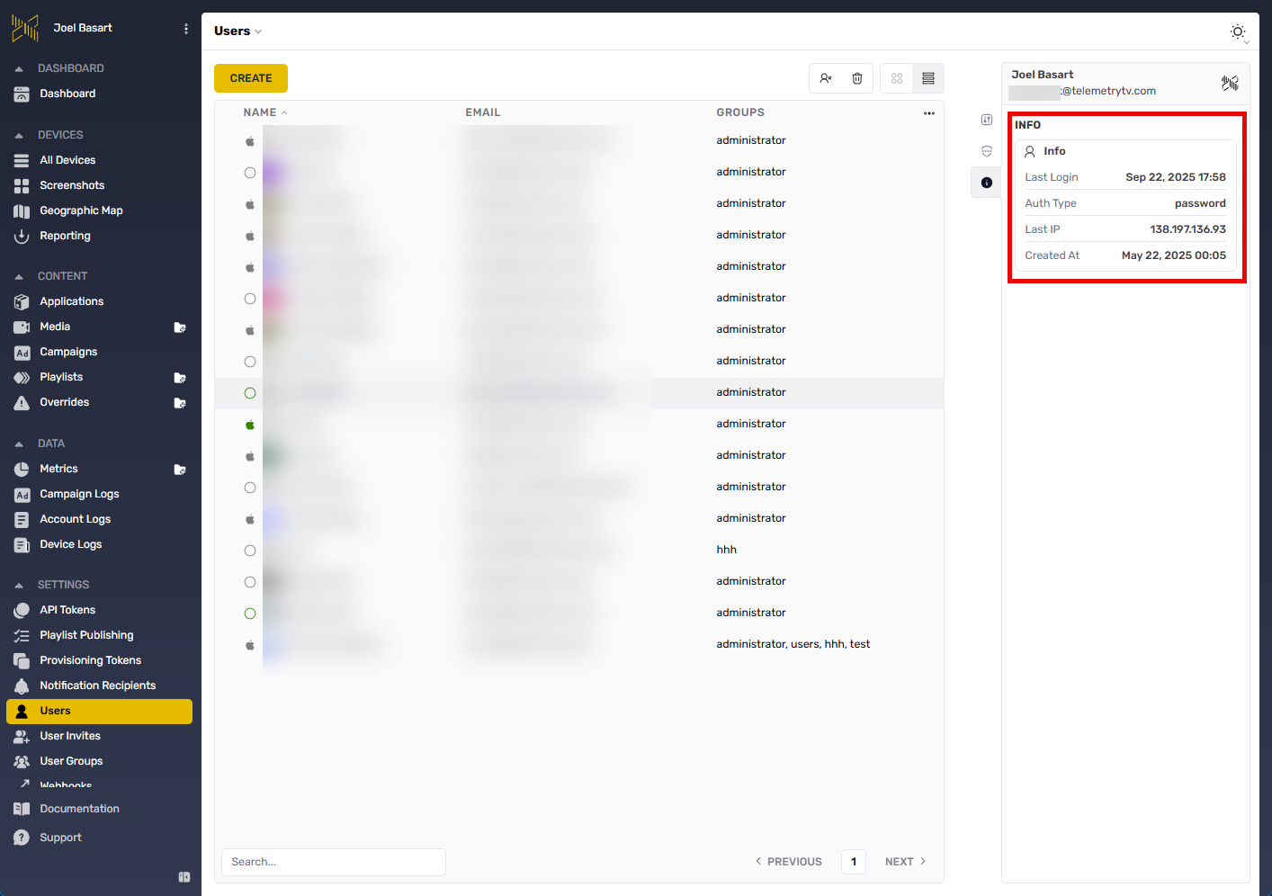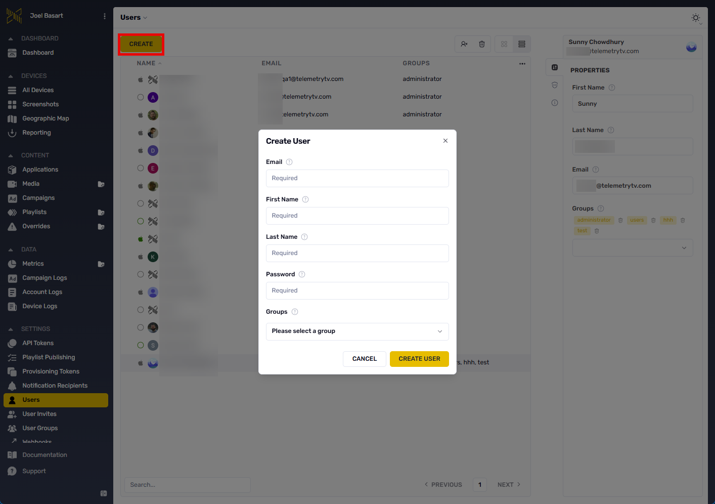 Invitation workflows require email address specification and user group assignment during account creation. Group assignment determines permission scope and resource visibility—administrators can constrain access to specific device organizations, content types, or system features through group-based permissions.