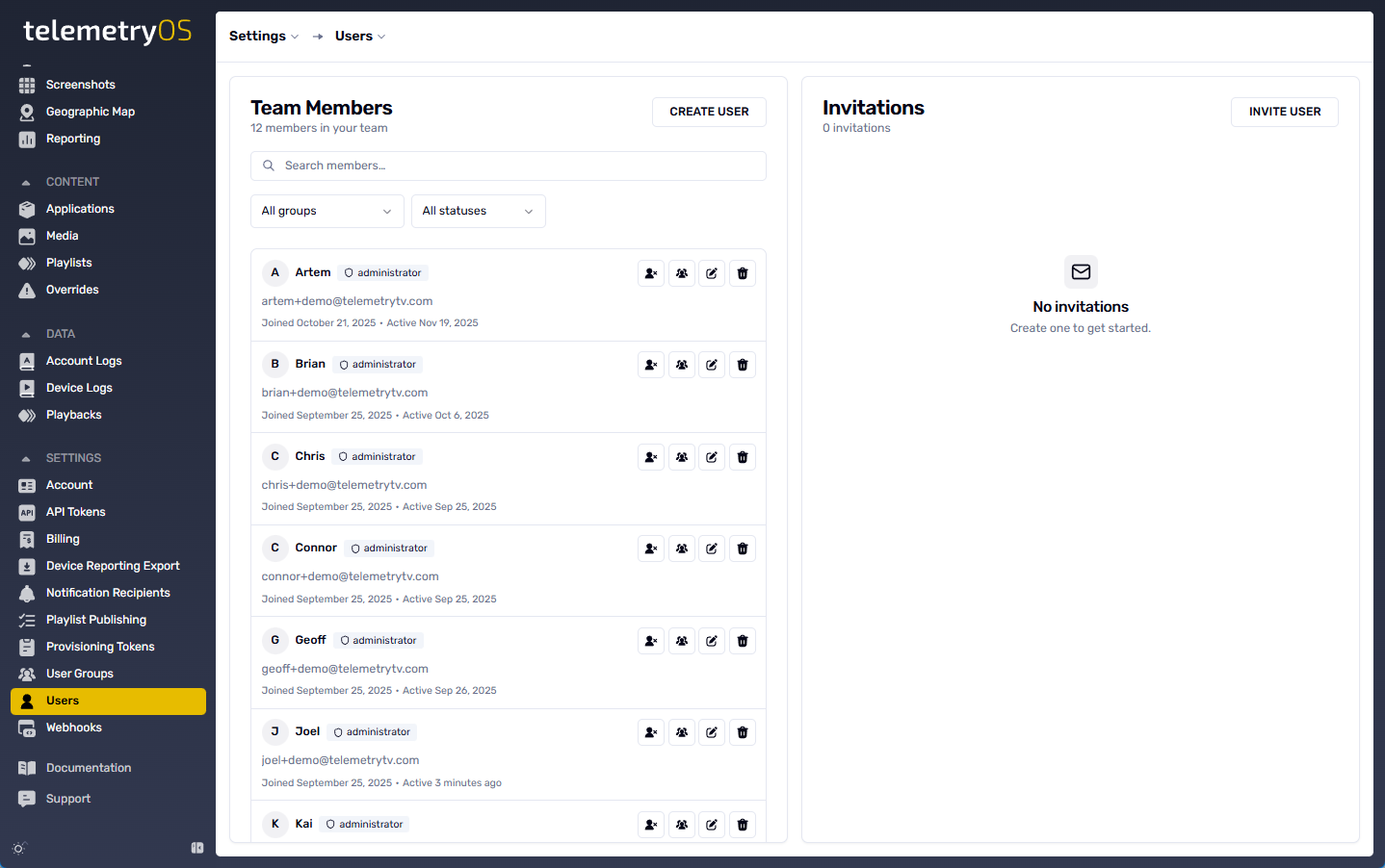 TelemetryOS supports multi-user account structures where multiple individuals access shared organizational resources with role-based permissions. This collaborative architecture enables teams to manage digital signage deployments without sharing credentials, maintaining individual accountability and granular access control.