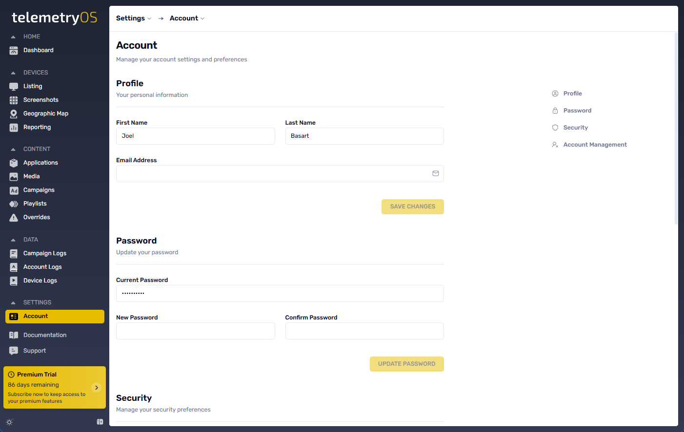 Account settings centralize personal profile information, security preferences, and connected service integrations within the TelemetryOS administration interface. Understanding these configuration options enables selection of appropriate defaults aligned with organizational security policies and operational requirements.